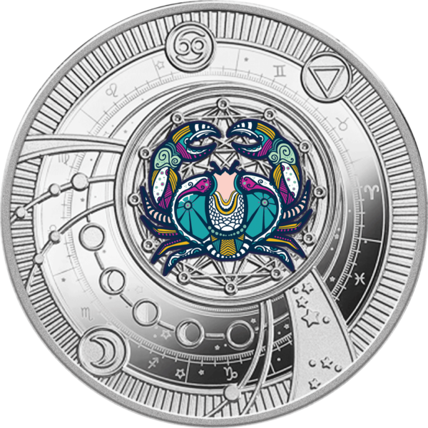 This exquisite silver coin is part of the “Zodiac Signs” series and is dedicated to Cancer, the symbol of intuition, protection, and deep emotionality. Ruled by the Moon, this sign embodies sensitivity, loyalty, and an innate concern for loved ones. The coin is minted in Proof quality, featuring a detailed design and rich colours. An elegant pendant ring allows it to be worn as jewelry, keeping a symbol of inner harmony and peace of mind close to you. The coin is issued in a case with a certificate of authenticity and is strictly limited to only 599 pieces worldwide.