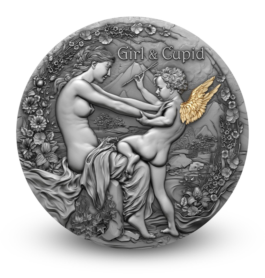 This exquisite 2-ounce silver coin depicts a scene of poetic love between a girl and Cupid, the symbol of inspiration and passion. The antique finish, magnificent relief, and selective gilding highlight the refined beauty of the composition. The reverse shows an elegant girl accepting the love of the charming Cupid — an ode to human feelings and eternal harmony. The coin is issued in an elegant case with a certificate of authenticity and is limited to only 500 pieces worldwide.