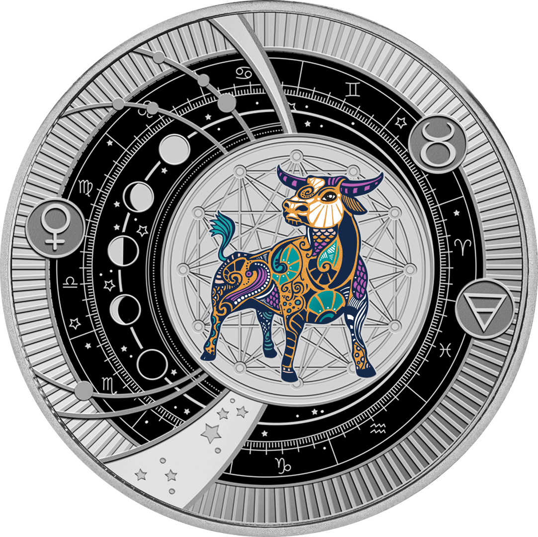 This elegant silver coin is part of the “Zodiac Signs” series and is dedicated to Taurus — a symbol of steadfastness, loyalty, and a deep connection with nature. The reverse depicts a majestic bull surrounded by cosmic and astrological symbols, including moon phases, the sign of Venus, and zodiac constellations. Minted in Proof quality, the coin showcases intricate detailing that highlights the harmonious and confident nature of Taurus. An elegant pendant ring allows it to be worn as jewelry, displaying its beauty anywhere. The coin comes in a presentation case with a certificate of authenticity and is strictly limited to 599 copies worldwide.
