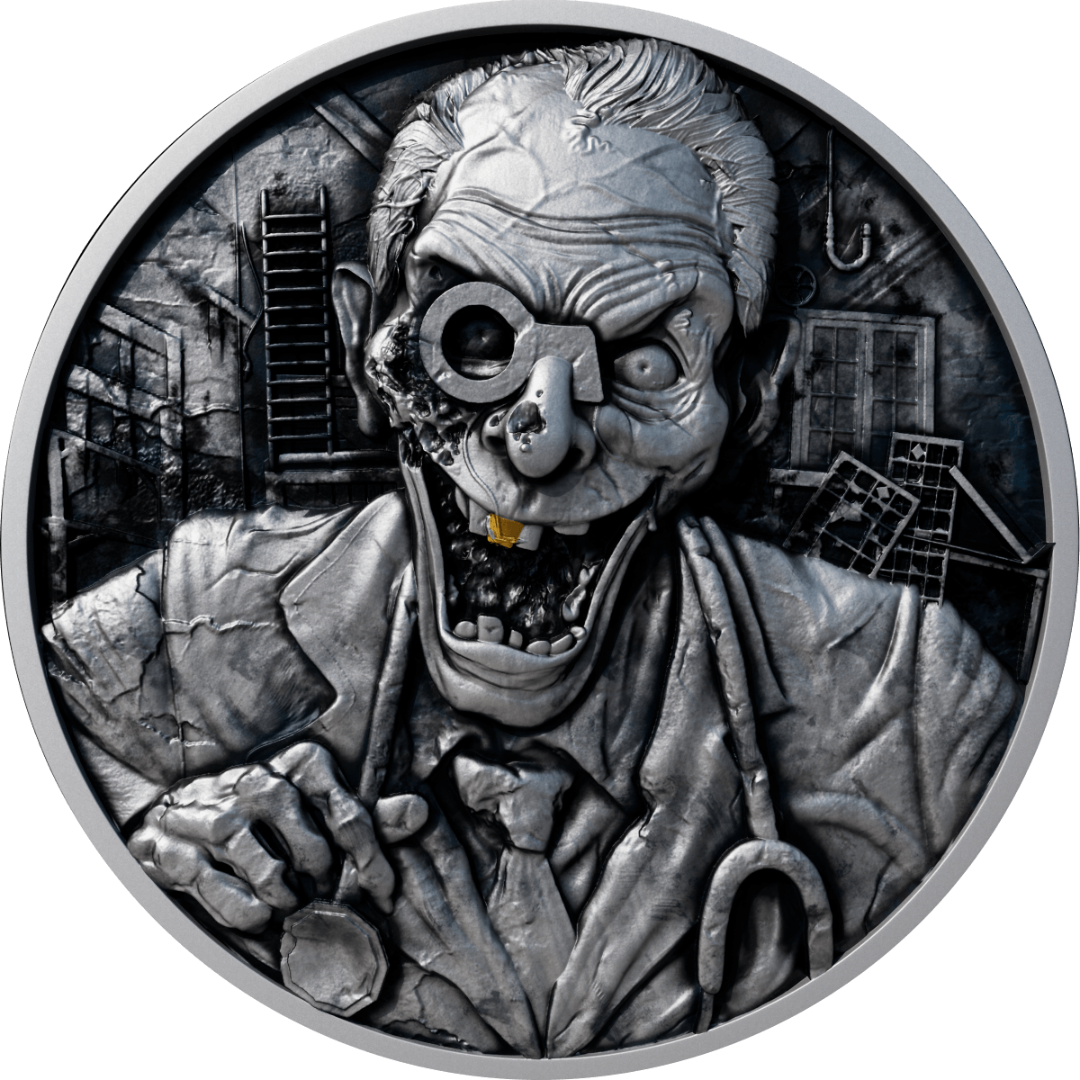 This eerie and enigmatic 2 oz silver coin immerses us in the dark and unsettling world of psychiatric asylums, a place where the line between reason and madness begins to blur. At the center of the composition stands a deranged doctor, both guardian and executioner, embodying the twisted face of authority.