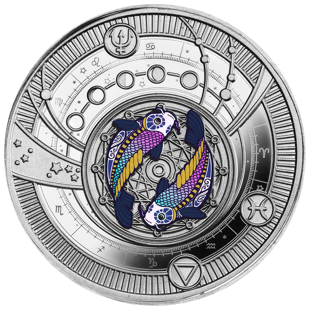 This exquisite silver coin is part of the “Zodiac Signs” series and is dedicated to Pisces, the mysterious and sensual water sign ruled by Neptune. It embodies the depth of intuition, emotionality, and artistic nature of those born under this sign. The coin is minted in Proof quality, featuring filigree detailing and a bright colour accent. An elegant pendant ring allows it to be worn as jewelry, emphasizing the refined style and inner harmony of the owner. The coin is issued in a case with a certificate of authenticity and is strictly limited to only 599 pieces worldwide.