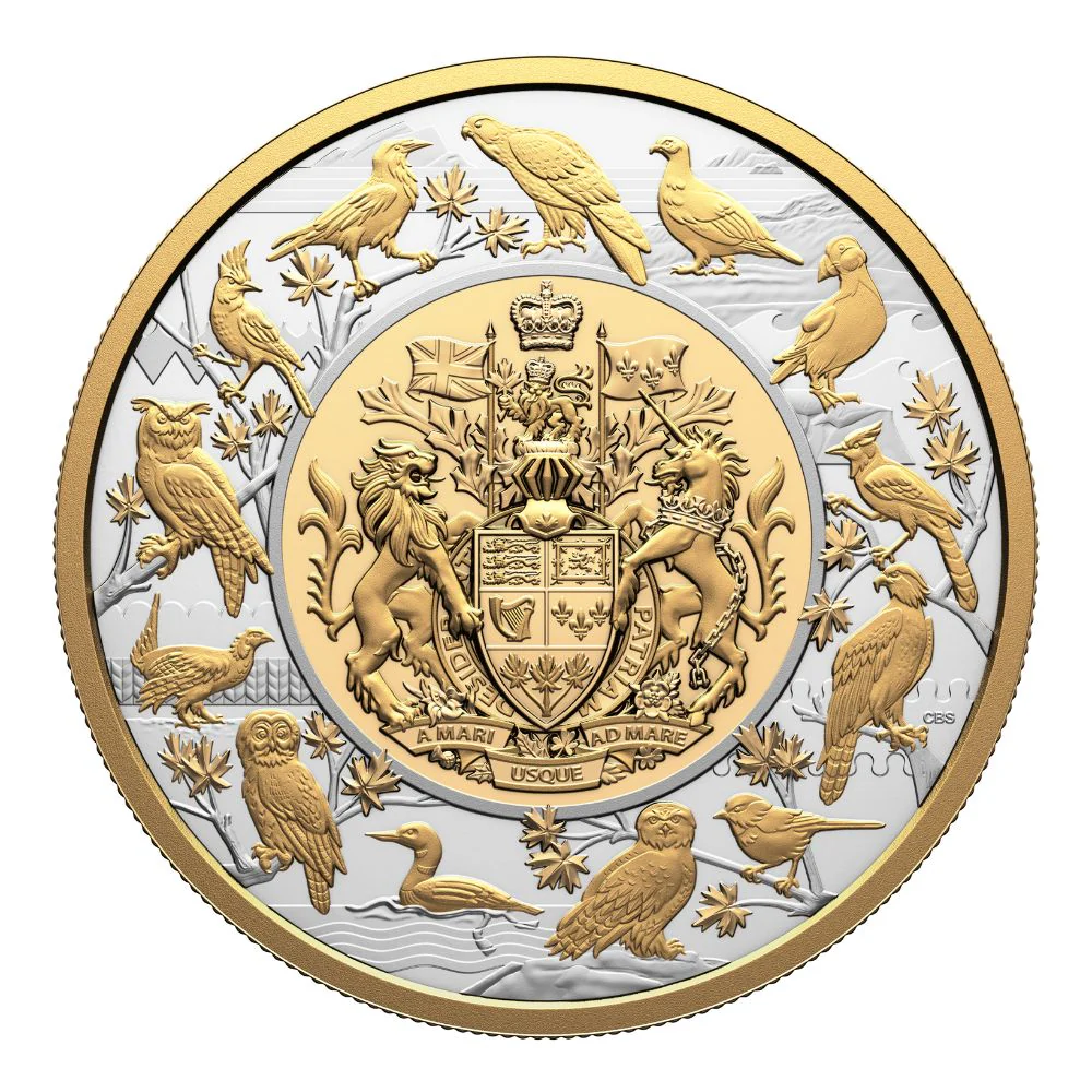 This impressive collector coin is struck from 5 ounces of pure silver and enhanced with selective gold plating. The reverse features the new Canadian coat of arms designed by artist Cathy Bursey-Sabourin, the official version now used throughout the country. Its large 65 mm diameter allows the intricate heraldic details to be fully appreciated, including a decorative border depicting 13 provincial and territorial birds, forming a symbolic and visually rich “landscape” of Canada. Each coin is presented in a Royal Canadian Mint presentation case with a serialized certificate of authenticity. The mintage is limited to 1,300 pieces.