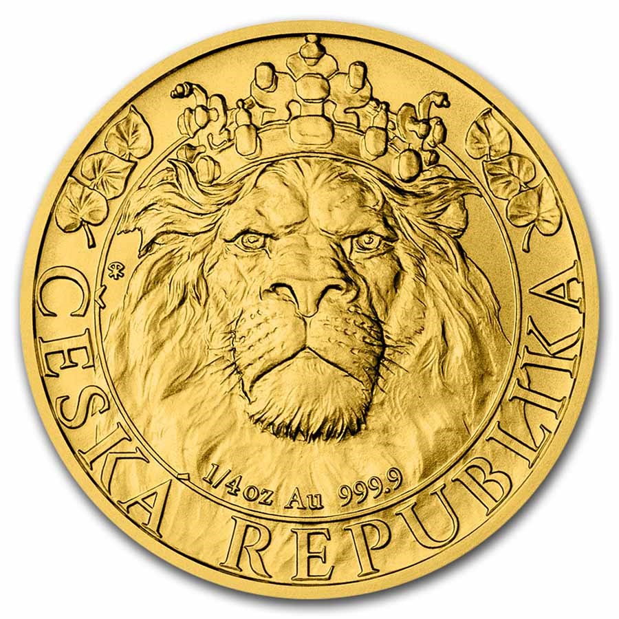 The Czech Lion 1/4 oz 2022 gold coin continues the popular coin series from the Czech Mint with a completely updated design in its fourth edition. The reverse features the famous two-tailed Czech lion with the crown of St. Wenceslas and a linden branch, symbols of Czech statehood. The obverse features a profile portrait of Her Majesty Queen Elizabeth II, the denomination and year of issue. The coin contains 1/4 ounce of 9999 pure gold and is a limited edition of only 4,970 pieces.
