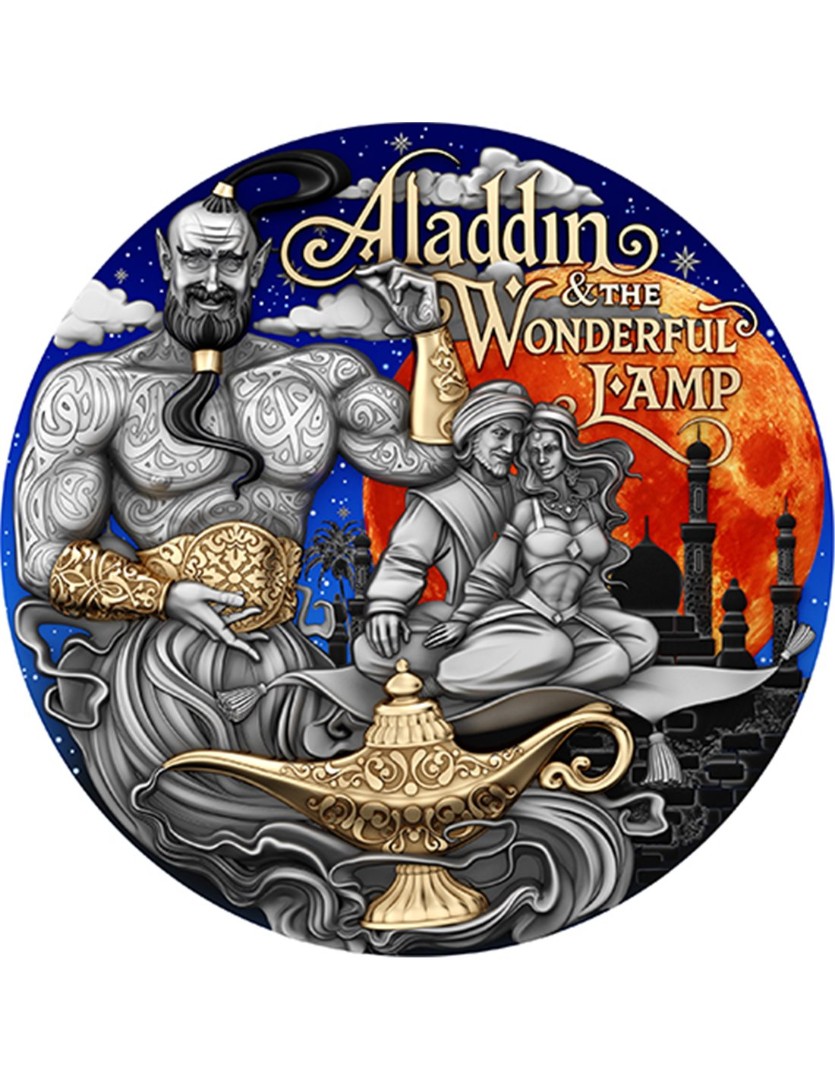 Niue: collectible silver coin Fabulous Stories. Aladdin and the Wonderful Lamp 2025 (gilded, colored), 62.2 g pure silver (0.999)