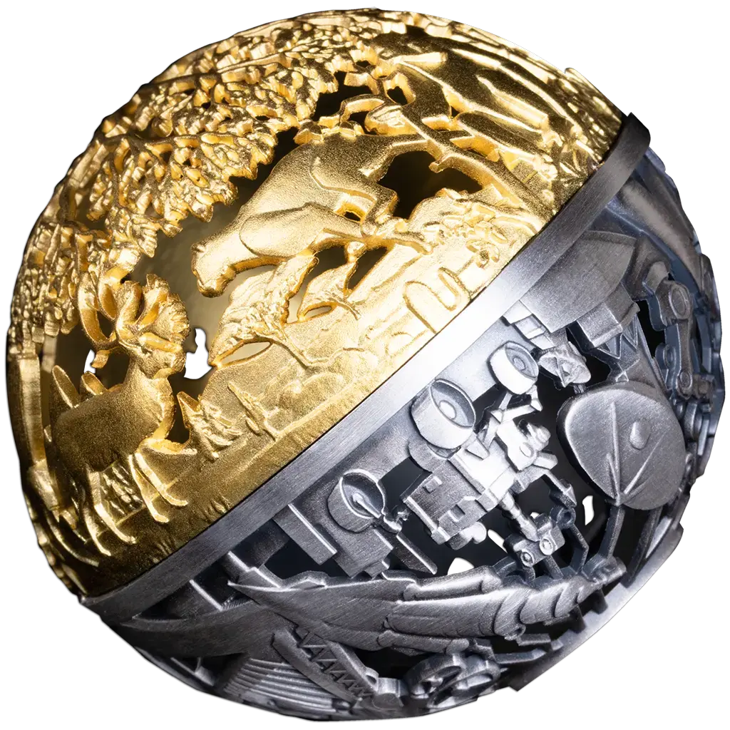 This outstanding 2 oz spherical silver coin embodies the harmony between the primal forces of nature and the rapid technological advancement of humanity. Its unusual shape reinforces the concept of balance, giving the design a distinctly futuristic and memorable character. The antique finish, combined with ultra-fine filigree and 24-karat gold plating, highlights the depth of the artistic concept and the craftsmanship behind the piece. The coin comes in a case with a certificate of authenticity. The limited mintage is only 1,499 pieces worldwide.